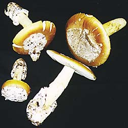 A delicious Autumn mushroom, Amanita calyptrata (Coccora to the Italians) resembles most other edible Amanita in texture, smell and taste. It has a distinct fishy odor, a soft texture upon cooking, and a nutty flavor. It grows quite large (those shown here ranged from 5" to 8" tall) under tanoak and live oak in the California coastal mountains. The cap is light yellowish brown (never greenish), with a solid patch of veil remnant on the top. The volva is thick and sac-like, often over two inches tall. Like other Amanita, the gills and flesh are white. Mature specimens often have a hollow stem with pithy cotton filling. I have found it growing near Boletus satanis and Pleurotis ostreatus after the early rains. As with any mushroom, be absolutely sure of your identification before eating it, as this mushroom is closely related to several species that can kill you. The descriptions you'll find on this website are not sufficient for identification. (This is only a cookbook, after all!)
