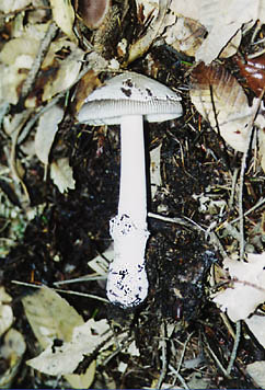 Amanita constricta frequents oak trees in the Santa Cruz mountains in late Winter, and although it is one of the edible "grisettes" I have not yet tried it. It has a grey cap with clearly visible striations around the rim, it usually has a large patch of universal veil remaining on the cap (like the specimen above), and most notably, its volva has a constriction just above the basal bulb, and below the flaring extra veil tissue. It does not have the same characteristic fishy odor that many of the other edible Amanitas share, and I have come to trust that fishy odor as a confidence-inspiring marker for identification. Therefore, I have not yet developed the confidence to eat this species.