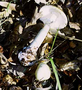 Amanita OcreataDon't eat this mushroom. It can kill you. Not as common as A. phalloides, but just as deadly. Pure white from cap to base, although occasionally turning slightly tan on the cap in older specimens, beginners have mistaken it for Agaricus campestris and other white edibles. Beginners should learn to identify the genus Amanita by the volva at the base, along with white gills and spores, and nobody should eat any Amanita until thoroughly confident of its identification. I found this specimen in the Santa Cruz Mountains in late Autumn under live oak and valley oak, a few steps away from some edible Amanita calyptrata (which unfortunately were too old to collect.)