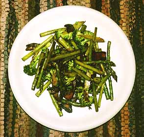 Fry the chopped mushroom in olive oil for about 3 minutes on medium high heat. Toss in the asparagus, cover for 4 minutes, stirring a few times, until almost cooked but with slightly blackened edges. Put in the brocoli and balsamic vinegar and cover for 3 minutes. Add the butter, stir till it melts and remove from heat. Toss in the green onion and serve over rice. Serves four.