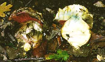 The name alone gives this rather obscene looking bolete a bit of a reputation. Notoriously poisonous, but not deadly, this mushroom favors oaks in the Autumn in California and Southern Europe. Some people even eat B. satanis after thorough cooking, but I don't recommend it. I find the smell to be rather disgusting, personally. Satanis can grow huge and obese, sometimes becoming football size. The cap is tan with an olive green tint, the pores range from blood red to orange in color, and the flesh stains blue when cut. The specimen pictured above was small and a bit old, so the blue-staining reaction was not as apparent.
