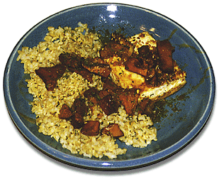 Take half of the cooked mushroom/shallot mixture and spread onto the bottom of a covered ceramic roasting dish. Place slabs of tofu on top of the mushrooms, then spread the remaining mushrooms on top of the tofu. Pour the sauce mixture over everything, cover, and place in the oven for 25 minutes. Remove the cover and cook for an additional 15 minutes, until the tofu begins to brown and the sauce begins to caramalize. Serve over rice.