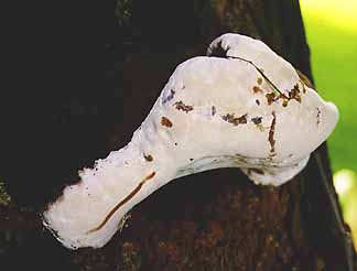 Ganoderma applanatumThe artist's conk grows on dead or dying hardwoods, maintaining a perrenial woody shelflike fruiting structure that turns white with an active spore surface during the rainy season. Its spore print is reddish-brown, and usually easily apparent under the fruiting surface. It derives its nickname, artist's conk, from the fact that its white pore surface stains brown with the lightest touch, allowing you to draw on it with a stick or a finger (notice the brown line at the bottom left of the photo, where I made a light stroke with the tip of my finger.). I am listing it here because some herbalists credit it with medicinal properties similar to those described for its shellac-polished cousin Ganoderma tsugai (reishi or ling chi), or possibly Trametes versicolor (turkey tail) - that is to say, immune-strengthening properties. It certainly is not a desirable edible, having the consistency of cork and a flavor as bitter as unsweetened coco. For use as an herbal medicinal, harvest the fresh growths with a very sharp knife, hammer, or hacksaw, then cut into thin slices and dry. Boil the dried slices in water for at least 20 minutes, then allow the mixture to soak for a while to make a strong tea. You may want to add licorice root or honey, since it's rather bitter. Drink the tea and leave the cork behind.