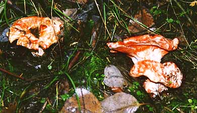 The so-called lobster mushroom isn't really a mushroom, but it is delicious. H. lactifluorum is actually a parasitic fungus that attacks certain species of Russula and Lactarius, engulfing the entire mushroom in a bumpy crust that resembles the shell of a lobster, rendering them bright red-orange, firm textured and surprisingly tasty. I found the ones pictured above in the Pugeot Sound area, but I have never seen them in California. I was cautious with eating these, although I later found some for sale at Pike Street Market in Seattle. I was cautious because there really isn't any easy way to know which mushroom species was originally attacked by H. lactifluorum. Conceivably, a toxic species (such as Russula emetica) could retain its toxicity even after becoming enshrouded in lobster skin. Oddly enough, I have never heard of any poisonings from it, so perhaps the parasite actually renders its host edible, or perhaps (as Arora points out) it might only attack edible species.