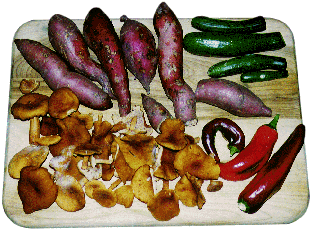 This dish takes advantage of the intense maple-syrup aroma of Lactarius fragilis. The candy cap is a mushroom whose smell alone makes any dish seem sweet. Your friends will think you have been burning brown sugar incense. The remaining ingredients simply carry the smell. By the way, you can also add candy caps to a more traditional sweet potato casserole for a holiday treat.
