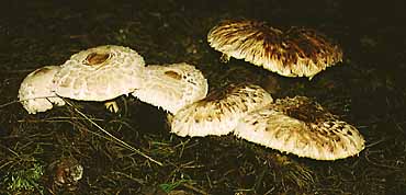 The shaggy parasol is one of the few choice edibles that favors even the difficult growing conditions under eucalyptus and redwoods. The ones pictured above are a bit old. The young, smooth, closed buttons are the best! L. rachodes is a large mushroom that seems to grow just about anywhere. It has white gills, white spores, shaggy fibrous scales on its cap, and an easily discernable dull orange staining reaction when cut at the base of the stalk. You can typically find a bulb at the base of the stalk that resembles the volva of an amanita (at least in the variety hortensis that appears frequently on the West Coast); but you will not find any remnants of a universal veil around the bulb, like on the volva of an amanita, even though the scales on the cap of L. rachodes might resemble veil remnants to a casual observer. You should also make careful note of the spore color. If the spores are greenish, don't eat it! The poisonous green-spored Chlorophyllum molybdites looks strikingly similar to L. rachodes and sometimes even stains dull orange. Apparently, the C. molybdites prefers warm weather and lawns, whereas L. rachodes prefers cool rains and woodland environments, but always be cautious when collecting this mushroom.