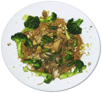 Presentation: spread out the quinoa onto the warmed plates, then sprinkle each plate with the roasted chestnut meats. Remove the chunks of brocoli from the stirfry, and place them around the edges of the plates, then scoop the mushrooms with the remaining vegetables and broth into the middle.