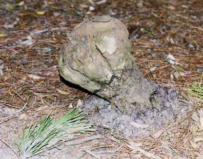 I can't imagine anyone trying to eat this thing, nor would I dare try it myself. Such an amazing growth to look at, I felt compelled to include it in this fungus gallery. Apparently it has a place in the Chinese medical pharmacopea, but I don't know what for. Pisolithus tinctorius resembles a puffball in some ways, but it's laden with a sticky purple-black tar. On the outside you might mistake the youngest specimens with Calvatia gigantea, but if you cut it open you will find it filled with little granules, each holding spores, glued together in a sticky dark mass - nothing like the pure white tofu consistency of the giant puffball. P. tinctorius (dead man's foot) seems to favor disturbed places, paved areas and roadsides, fruiting early in the rainy season.