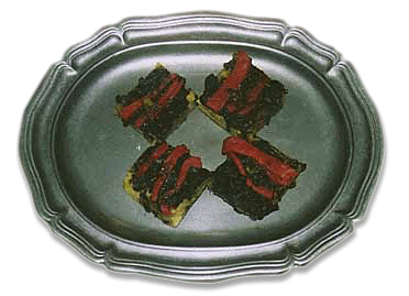 Broil or grill the polenta to brown the exterior and heat thoroughly. Place on the serving dish and pour a portion of the mushroom sauce over top. Place several thinly sliced strips of roasted red peppers on top and serve.