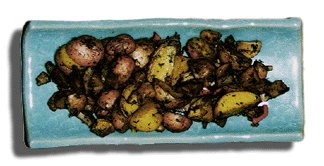 A savory, spicy hors d'oeuvre or side dish, in a Spanish style. In Spain, the tradition of tapas tasting involves sitting around in tapas bars during the late afternoon hours, sampling light delicacies while sipping a hardy red wine. This variation uses the strong taste and firm texture of young Prince mushrooms, sautéed with baby red potatoes in red wine and garlic. Try serving it with some bread and salted olive oil, red wine, and perhaps some anchovies, green olives or pickled herring.