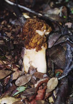 Commonly called "early morel," the Verpa is closely related to the morel, and it sprouts around the same time of year; but it differs in several significant ways. First, the verpa cap is separated from the stalk, whereas the morel cap is connected (note the chunk of cap that has fallen away from the specimen in the photo.) Second, the Verpa does not have true pits on the cap, like the morel, but rather has rows of vertical wrinkles. These closer wrinkles also distinguish the verpa from the poisonous Gyrometra esculenta, which has a more rounded, lobed "brainlike" cap.