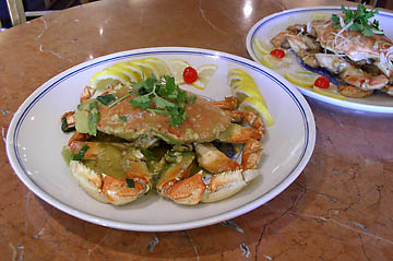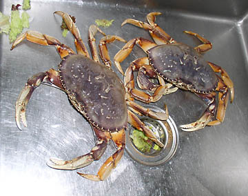 I asked O'Shea to divulge his boiling methods. He uses a large pot with "a lot of salt" - I'll guess about 1/2 cup salt for two dozen crabs. At home you might use a 12-quart stockpot with 2-3 tablespoons of salt for one or two crabs. He brings the salted water to a high rolling boil (the water should boil for about 30 min. to ensure even heat), then he places the live crab into the boiling water for 18 minutes. He warns that the crab will continue to cook after pulling it from the water. To stop the cooking process, he immediately transfers the crab from the pot to a container of ice water (half ice cubes, half fresh water.) This stops the cooking, leaving the meat moist and tender. I asked O'Shea how he likes to eat crab. "I like it best cold, boiled and cracked, with a salad and a sweet potato." James Pei agrees that crab doesn't need strong sauces, which only overpower its delicate flavor. On the other hand, you can add strong spices to the boiling water for a classic Southern style crab boil. The spices will scent the crabmeat but they remain in the pot when you pull the crab out. The crab still takes center stage. You can add equal amounts of salt, coriander, paprika, hot pepper flakes, thyme, and a few bay leaves for a savory seasoned crab pot. Smaller portions of dill, allspice, cloves and mustard seed will round out the flavors, with a few halves of onions and fresh lemons. You could also use a premixed crab-boil spice blend. Zatarain's makes the most common. If you wish to serve crab hot from the pot, you might prefer to boil it only 10-12 minutes, rather than the 18 minutes that O'Shea uses. The crab will finish cooking as it makes its way to the table. Not for the Squeamish Many cultures prefer to clean their crab alive. Some feel that boiling pulls away the sweet flavors, and that live cleaning maintains the freshest tasting crabmeat. Some Americans might find this a bit troubling, especially when they're accustomed to finding their meat wrapped in plastic. A topic worth examining (perhaps in another article), eating meat involves killing. When we start with a live animal in the kitchen, we get much closer to this reality, disturbing though it may feel. Pei's recipes, which follow below, begin with live cleaning. However, if you buy live crab in the market, you can request that they clean it for you. Most good markets will perform this service, sometimes for a small fee. If you feel brave, begin by grabbing the crab from behind. Healthy crabs move fast and can seriously hurt you with their pinchers. With a knife or screwdriver, pry the top of the shell off the crab and quickly scoop out the lungs and pith in the center. This action kills the crab quickly, but you should still be careful of the pinchers, which can catch you with reflex action. Quickly break off the legs and claws, then with a cleaver cut the body in half lengthwise (down the axis of symmetry). One or two more cuts horizontally will break the center meat into manageable portions. You might wish to keep the back shell for presentation after the meat is cooked. If so, clean the inside with a brush and water. Lastly, crack the leg shells and body meat in various places with a hammer, to make it easier to eat later. You should cook the crab within a few hours of cleaning, keeping the meat cold until you're ready to cook.