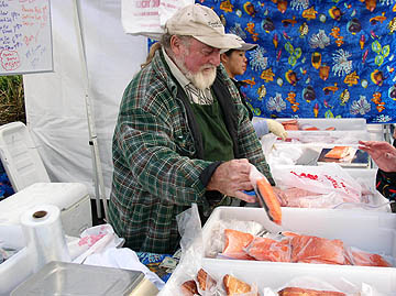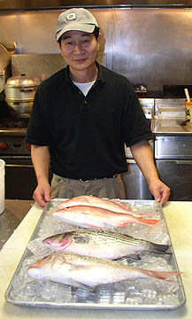 The eyes of freshly caught fish look black and beady. Milky or sunken eyes are sure signs that a fish has been dead too long. When you lift up the gill flap, you should see bright firm coral-red gills. Older gills become marked with red-black clots. When you gently poke the flesh, it should feel firm and resilient, almost rubbery. As the flesh ages, it rebounds less to finger pressure and the indentation remains. Iced or Live? I asked Chef Pei about the different ways that fish come to market: living, iced, or deep-frozen. He explained that usually only the freshwater fish and shellfish get sold from live tanks, in part because saltwater tanks cost a lot to maintain. However, live fish from tanks are not necessarily better than frozen. Dirty tanks can impart bad flavors. Crowded conditions can stress the fish, also affecting flavor. Most ocean fishing boats clean their fish immediately after catching, then place them on ice or in deep freeze depending on when they expect to go to market. Fish that have been frozen immediately after catching can maintain fresh flavors for months if vacuum sealed. Fish on ice (not frozen) will stay fresh for several days and generally have the best texture. Once thawed, fish should not be re-frozen. If you buy fish on ice or alive, you should eat it the same day. You can ask your fishmonger to kill and clean live fish for you before you take it home. Market Fresh on Sunday