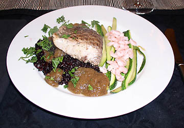 6 Shiitake mushroom caps 1 cup black Japonica rice The rice and sauce take about 40 minutes, so begin with these. Start the rice with water and a dash of soy, and bring to a light boil before covering pot. Simmer on low for about 35-40 minutes, observing occasionally to make sure it's not burning. Dice the onion and the mushroom caps. If you are using dried mushrooms (Chinese dong gu or dried shiitake), then cut with scissors and soak for about 30 minutes in a cup of hot water beforehand. (Keep this water!) Place the sliced mushrooms and onions in a sauce pan with two cups water or stock (plus the rehydrating liquid in the case of dry mushrooms), 1 cup rice wine, a dash of soy and Worcestershire sauce. Bring to a boil and reduce for about 30 minutes, moistening with dry vermouth or extra water if needed. Toward the end of the reduction, add a spoonful of miso and stir it in, reducing heat to a low simmer. Allow the onions to caramelize slightly, but keep moist enough to avoid burning. Transfer the reduced sauce to a blender or food processor. Blend until smooth, adding more stock or water to thin if necessary. Keep this warm for use later. Sprinkle the shark fillet with salt and crushed Schezuan peppercorns. Sear the shark on both sides in a heavy frying pan, high heat, just until cooked through to the center, about 5 minutes total (depends on thickness.) Add a dash of dry vermouth toward the end to slow down cooking and steam the fish a bit. Serve the fillets on the black rice, drizzled with sauce. Serves 2-3 people.