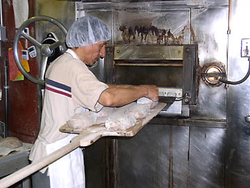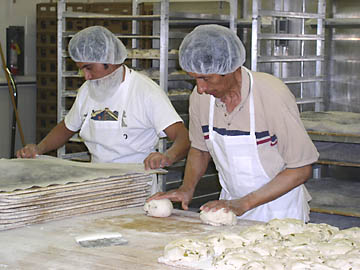 I blend together some flour and water in an open jar. I cover the jar with a single layer of cheesecloth, to keep out bugs and leaves. I place this bait in the back yard on a cool damp afternoon. In the evening, I bring the jar inside and cover it. Within a day or two its creamy contents begin foaming slightly. It smells a bit like dry white wine. I know I have captured my quarry. Our native wild yeast has fallen from the sky and established a colony in my jar of sourdough starter. I now posess a living bit of culinary history, one of the keys to an authentic sourdough bread. To make a loaf, I take two cups of starter, three cups of bread flour, and a teaspoon of salt. That's all. After kneading the dough, I let it rise overnight in a cloth covered basket. I bake it in a humid oven for about an hour. I replenish the starter every few days with water and flour, keeping its thin creamy texture, making sure it stays foamy and smells like clean fermentation. The sour flavors come from a local species of lactic bacteria, which convert sugars into acids and carbon dioxide. In return, the lactobacilli protect the wild yeast by creating an inhospitable environment for competing fungi. Sourdough's history dates to the dawn of agriculture, in Egypt and Mesopotamia. It probably arrived with Italian or French immigrants into Mexico, and then came north with the California Gold Rush. Here in San Francisco, it took on the unique flavors of our wild yeasts and bacteria. I grew up loving this bread, with its lemony bite and leathery thick crust. I remember chewing it with caution so as not to lacerate the roof of my mouth with shards of the toasty brown corners, the most flavorful part of the loaf. I remember noticing a change that occured in the bread from larger bakeries like Toscana, Colombo and Parisian, sometime in the mid 1970's. The sourness diminished. The crust got thinner. Modern Changes I later learned that the three companies had merged to become the San Francisco French Bread Company. They combined their operations into a large factory in Oakland. They changed their ovens to a high-throughput design. In return, these ovens enabled them to bake enough bread to ship around the country, over two million loaves a week. The thinner crust proves more palatable to average American tastes; yet this bread lacks the rustic magic. A few of the original bakers of San Francisco Sourdough still make excellent bread. The Boudin company started in 1849, and sells their bread primarily through retail bakeries around the Bay Area. I have purchased bread at the Boudin shop in Stanford Shopping Center. I like its clean tart flavor and crisp shiny crust. In the process of trying to reacreate this bread at home, I have developed great respect for the expertise of an artisan bakery. The last two decades have seen a resurgence in small craft bakeries, and a renewed appreciation for crusty flavorful bread. Mountain View hosts one of my favorite artisan bakeries: The Acme Bread Company. Acme Acme Bread started in Berkeley in the early 1980's. Founder Steven Sullivan worked as a bussboy at Alice Water's famed Chez Panisse while studying at UC Berkeley in the 1970's. He later went to Europe and learned traditional bread baking techniques, then returned to Chez Panisse to bake their house bread. In 1983, Sullivan left Chez Panisse to start Acme on the corner of Cedar and San Pablo in Berkeley, selling retail at the shop and wholesale to restaurants around the Bay. As demand increased, Acme opened a second wholesale-only bakery in 1990, branching southward into Mountain View in 1996. While Acme doesn't claim to make traditional San Francisco Sourdough, their naturally leavened breads surpass the larger sourdough bakeries in both texture and flavor. I visited Acme to learn their secrets. Acme's Mountain View production manager, Drew Westcott, walked