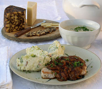 Colcannon This simple dish blends mashed potatoes with chopped cabbage and bacon. Of course, a healthy dose of butter helps pull it all together. (Time: 1 hour, serves eight.) 6 potatoes Peel the potatoes and boil for about 40 minutes, until soft. While they are cooking, prepare the other ingredients. When the potatoes have cooked, mash them with about 1.5 sticks of butter, adding some salt and pepper to taste. Slice the cabbage finely, like coleslaw. Slice the bacon into small pieces. In a heavy frying pan, fry the bacon until crisp on medium heat, about 10-15 minutes. Save the bacon drippings for the next step, and set the bacon aside. Melt two tablespoons butter with the bacon drippings in a large cast iron casserole or Dutch oven, on medium heat. Add the cabbage and sweat until soft, about 20-30 minutes. After the cabbage has cooked thoroughly, add the crisped bacon and chopped green onions to the pot. Blend in the mashed potatoes and adjust seasoning as needed.