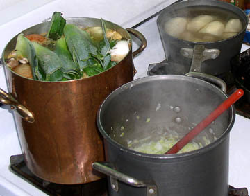 Healing with Leeks The healing power of leeks dates back to a legend of St. Patrick healing a dying woman. The woman dreamt of an herb flying through the air. Patrick asked her the nature of this herb, and she told him that it looked like marsh grass. Patrick then apparently transformed some rushes into the savory vegetable we now call leeks. When the woman ate the leeks, she became well again. Potato Leek Soup This potato leek soup tastes much better if you use homemade chicken stock, which takes time. If you use canned chicken stock, reduce the amount of salt accordingly, as almost all commercial stocks come heavily salted. (Time: 2 hours, serves 12 or more.) 6 leeks Remove the green tops and roots from the leeks (reserve for a stock later.) Chop the white part of the leeks finely. Chop the onions. Peel and slice the potatoes. Slice the bacon into small pieces. In a heavy frying pan, fry the bacon until crisp on medium heat, about 10-15 minutes. Save the bacon drippings for the next step, and set the bacon aside. In an 8 or 12 quart stock pot on medium heat, melt two sticks of butter. Add the bacon drippings, then the chopped leeks, onions, bay leaf, and about 1 tablespoon of salt. Sweat (without allowing to brown) for 30-40 minutes until soft. Deglaze occasionally with sherry to prevent the leeks from sticking to the bottom of the pot. After the leeks have softened, add the sliced potatoes to the pot and cover with about half of the chicken stock. Cook an additional 30 minutes. Keep adding additional stock and stir occasionally to prevent sticking. Add 1/2 cup sherry, the crisped bacon, thyme and parsley. When the potatoes are thoroughly cooked (about 30 minutes) add the remaining stock, half & half, and cream. Bring back up to slow simmer, then stir in some Irish whisky, salt and pepper to taste, and cook an additional 5 minutes, stirring occasionally to evaporate the alcohol and to prevent scorching. Purée the soup with an immersion blender, or place in a food processor a few cups at a time, until it has a smooth texture. Serve in bowls with a sprinkle of sliced green onions. Leftovers of this soup will become very thick the next day, because of the potato starch. When re-heating, thin with milk or chicken stock to the desired consistency.