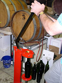 Then I learned more patience, as time did its work to soften the wine. Months passed as malolactic bacteria transformed the acids, and oak helped polymerize harsh tannins into long molecular chains that taste smoother. In Spring, I added sulfite to protect the wine from foreign invaders, then siphoned it off the "lees", the sludge of dead yeast cells that lined the bottom of each barrel. For the next several months, I topped off the slowly evaporating barrels with excess wine, keeping them full to prevent oxidation. A Lilliputian Jungle A winemaker quickly learns the many little critters that can help or hinder all efforts at attaining perfection. When I returned in late August from three months' travel, I ran down to the basement to check my wine. The tannins had softened, and the flavors had improved. However, I detected a subtle barnyard smell, like decaying grass, which probably came from a yeast called brettanomycin. Furthermore, I feared that my wine would become over-oaked if I left it any longer on the toasted oak chips that I had added to the barrels. I decided to bottle as soon as possible.