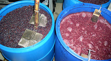 A few years ago, my friend Andrew Trice suggested a new way to get rid of the plums that messed up our back yards in July. He thought we might be able to make plum wine. Plum wine sounded like a great idea, since I was getting a bit tired of making jam and chutney every year with our sticky harvest, jars from the past decade still filling our kitchen shelves. We ventured over to Fermentation Frenzy, on San Antonio Road, to ask expert advice from Phil Montalbano. Phil set us up with some yeast starter, yeast food to keep the fermentation healthy, pectic enzyme to help dissolve the fruit, a five gallon glass jug and some air locks to allow gas to escape. An invisible lever flipped in my mind as I realized I had just discovered another outlet for my obsessions with flavor, nature, alchemy and the sensual world: I caught the winemaking bug. An Explosive Start That first attempt at plum wine showed promise, and it showed that I needed to learn a lot about winemaking. The wine was so acidic I added sugar to make it tolerable. I didn't account for the effects of secondary fermentation, and half of my bottles exploded in the basement while I was away. I returned to find a very sticky mess. To my amazement, the bottles that hadn't shot their corks turned into very good sparkling wine. My next trial used an old winemaking kit that my wife had kept since the 1980's. That effort resulted in an odd but drinkable German-style Hockheimer. Heartened by the results, I jumped headlong into very inky water. Fermentation Phil Back at Fermentation Frenzy, Phil patiently shared his advice and walked me through the equipment I would need to properly follow my crazy obsession. He recommended some books, taught me about an array of winemaking gadgets, and sold me additional glass storage jars (called carboys.) Hobbyist brewers and winemakers visit Phil's shop frequently to ask advice, or sometimes just to say hello. He runs a challenging business, which requires teaching how to use almost every small purchase, and advising the proper steps and timing to make one's efforts pay off. Fermentation Frenzy caters to all sorts of hobbyist fermenters, who make everything from beer and wine to vinegar, cheese, sourdough and soda pop. Most of Phil's customers make beer, buying ingredients like hops, barley, malt and yeast, and equipment like stainless steel boilers, hoses, valves, bottles, caps and capping tools. Phil also helps judge home-brews at various small brewers' festivals, including the one that Mountain View hosted during the 1990's. Phil Montalbano's energy helps glue together the whole community of South Bay brewing enthusiasts. By late summer, Fermentation Frenzy fills with winemaking gear, in anticipation of the harvest. Grape crushers, wine presses, oak barrels and fermentation tanks fill Phil's floor for the coming stampede of winemaking hobbyists like me. People can order grapes through the shop as well, and even help pick when the time comes, but I found my own source. My First Big Steps In late September 2002, I awoke at dawn and drove south to Paso Robles, where I had scored some zinfandel at Castoro Cellars. Every week I had been calling my friend Mikel, their assistant winemaker, asking when the grapes would be harvested. A few wineries will tolerate the intrusion of hobbyists during the frenetic harvest season. I have learned to bring cash for the grapes, to lend a hand when needed, and to stand clear of big machines. I filled three plastic barrels in the back of my van with fresh grape must pumped downhill from Castoro's crusher, 1200 lbs total costing $900. Three hours later later I returned home to figure how to get it into the basement.