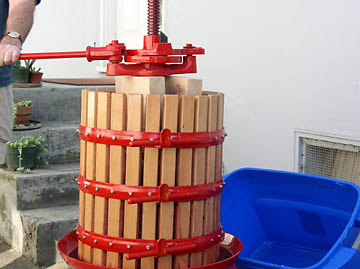 During fermentation I would occasionally push down the layer of grapes that rose to the top of the bubbling must, keeping the skins wet to prevent spoilage and to increase contact between grape and wine. After a week, the yeast had digested most of the sugar, and bubbling had almost stopped: time to press. I returned to Fermentation Frenzy and rented a large basket press for $50.